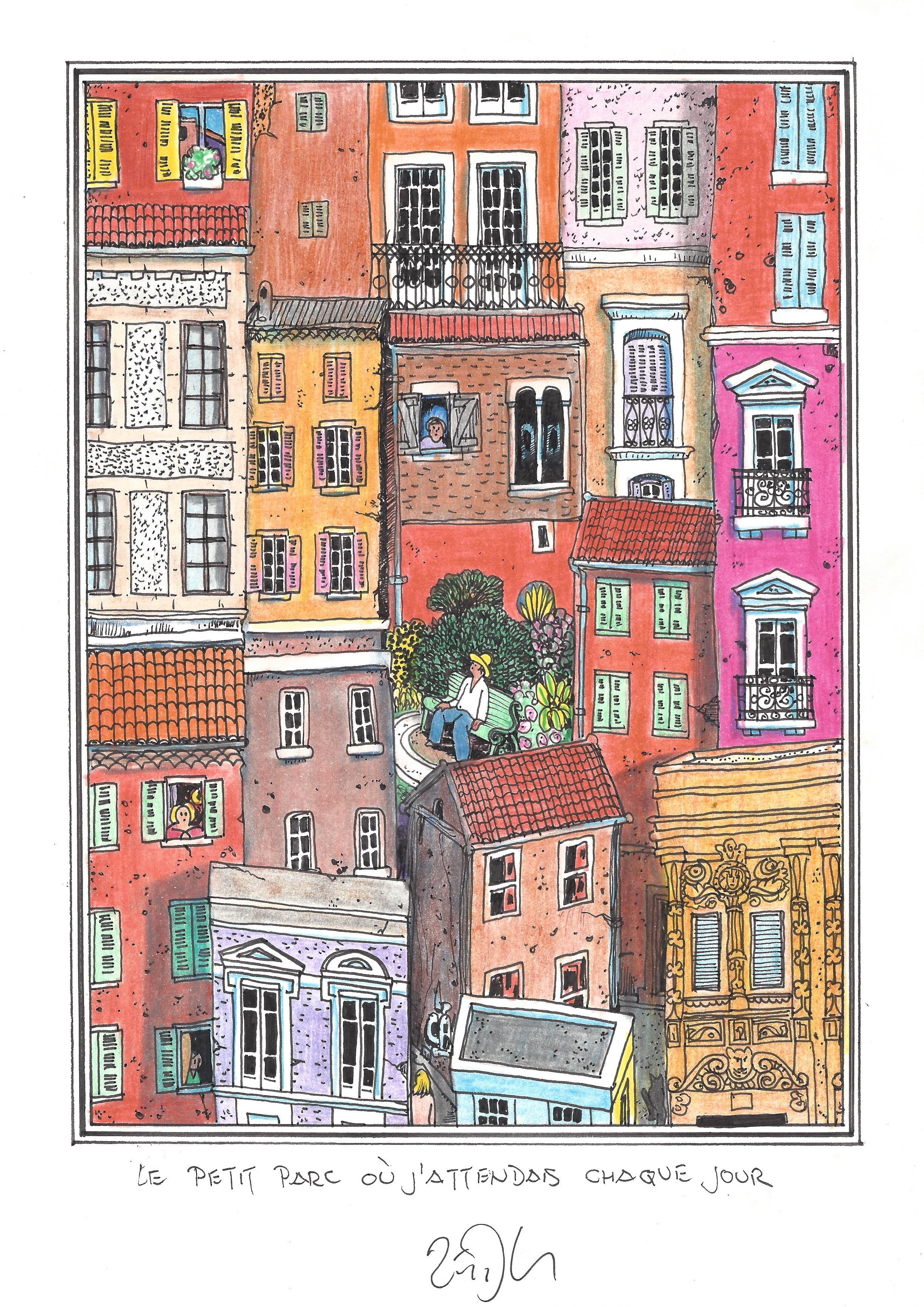 Drawing of the Day – 2758 – Dessin du jour « The little park where I waited every day – Le petit parc où j’attendais chaque jour » Ink & colour on Paper – 8 x 12″ (21 x 30 cm) – Encre & couleurs sur Papier