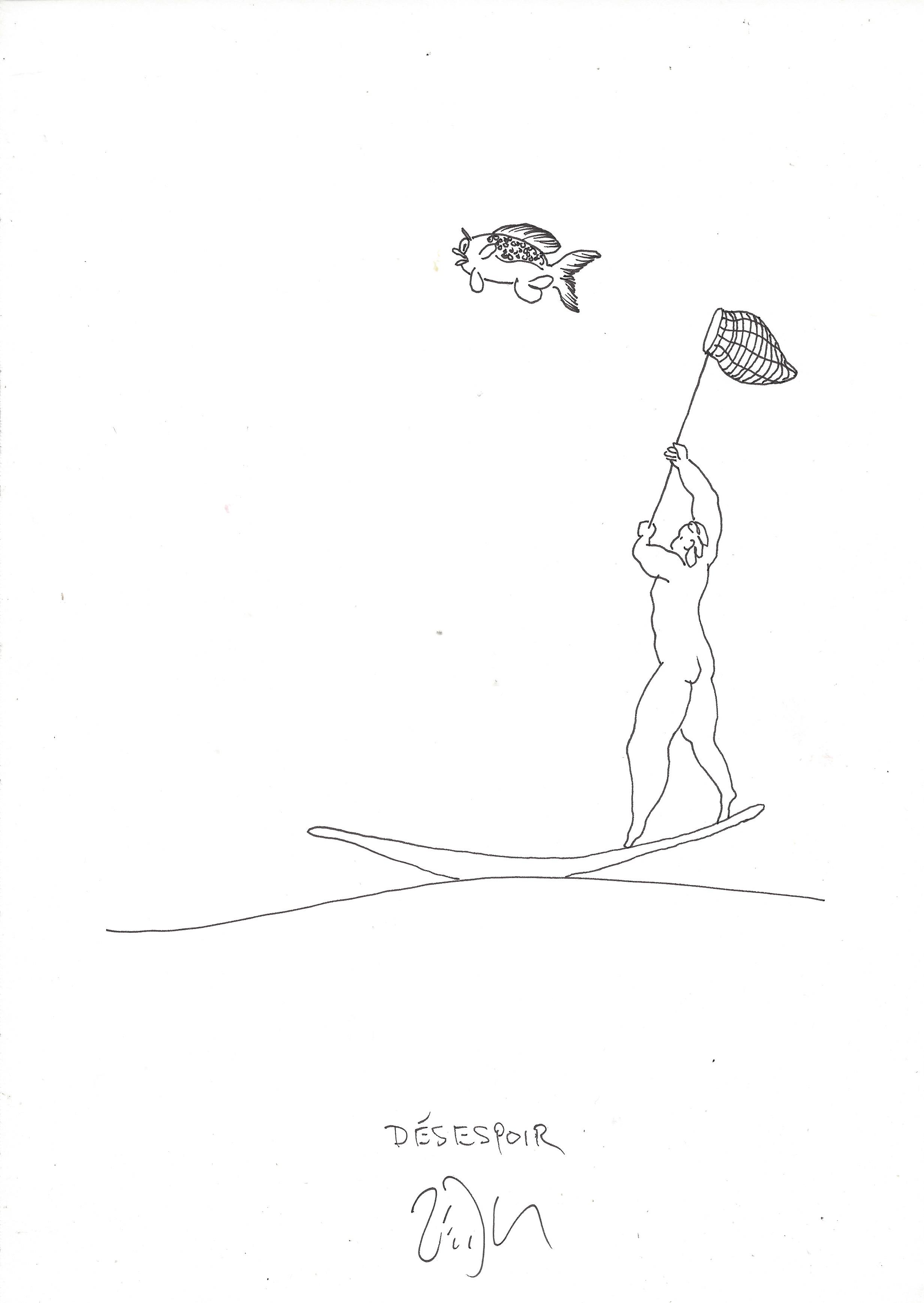 Hi there. I reckon the fish is the desperate one, since it manages to fly that high, trying to escape the net (?). Great drawing, as usual. I envy you the ability to make it so simple, but still so expressive. 🙂 🙂
