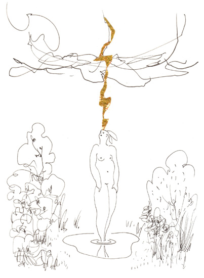 Drawing of the Day – 0102 – Dessin du jour “In her own lake – Dans son lac” Ink and collage on Paper 7.5×11″ (18x28cm) Encre et collage sur Papier Drawing of the Day available for CDN $ 99 Dessin du jour disponibles au prix de 99 $ CAD