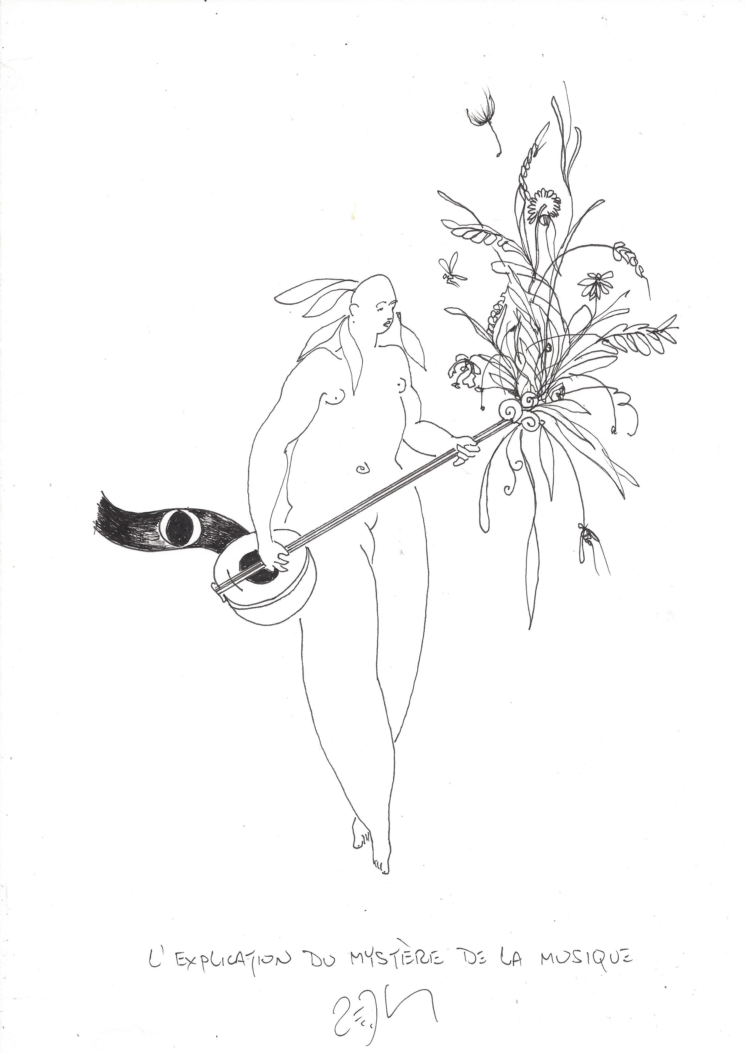 Drawing of the Day – 1038 – Dessin du jour « The mystery of music explained – L’explication du mystère de la musique » Ink on Paper 8×12″ (21x30cm) Encre sur Papier Drawing of the Day available for CDN$ 150 (125€) Dessin du jour disponible au prix de 125€ (150 $CAD)