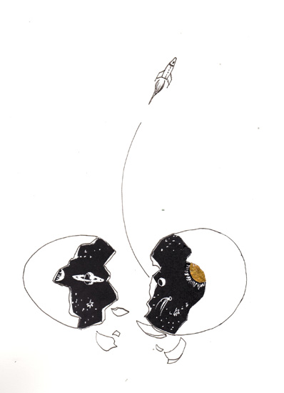 Drawing of the Day – 0168 – Dessin du jour “The cosmic egg – L’oeuf cosmique” Ink and collage on Paper 7.5×11″ (18x28cm) Encre et collage sur Papier SOLD