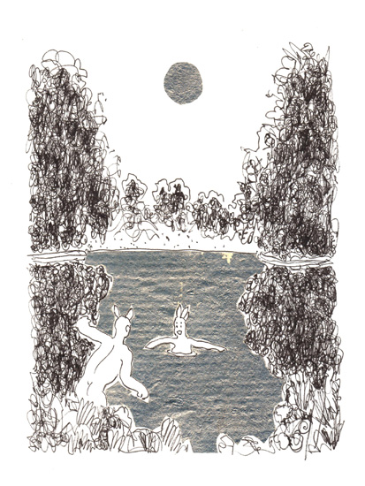 Drawing of the Day – 0172 – Dessin du jour “Midsummer night’s dip – Bain de minuit” Ink and collage on Paper 7.5×11″ (18x28cm) Encre et collage sur Papier Drawing of the Day available for CDN $ 99 Dessin du jour disponibles au prix de 99 $ CAD