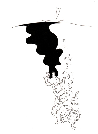 To me it looks like ‘An octopus takes lovers’. Aren’t there both a male and a female in its grip; a loving couple? I like the drawing very much, Frank. Keep it up. Has the exhibition started/ended? I must admit I don’t remember the dates right now. Good luck, anyway. 🙂 🙂 🙂