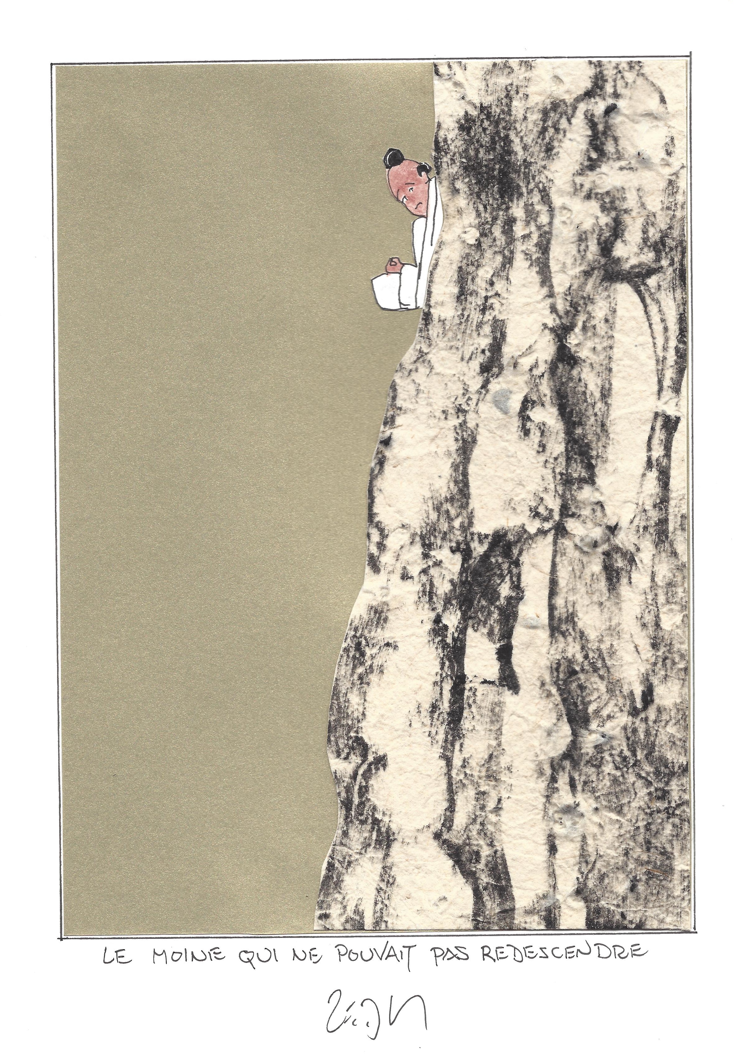 Drawing of the Day – 2375 – Dessin du jour « The monk that couldn’t get back down – Le moine qui ne pouvait pas redescendre » Mixed Media on Paper – 8 x 12″ (21 x 30 cm) – Technique mixte sur Papier