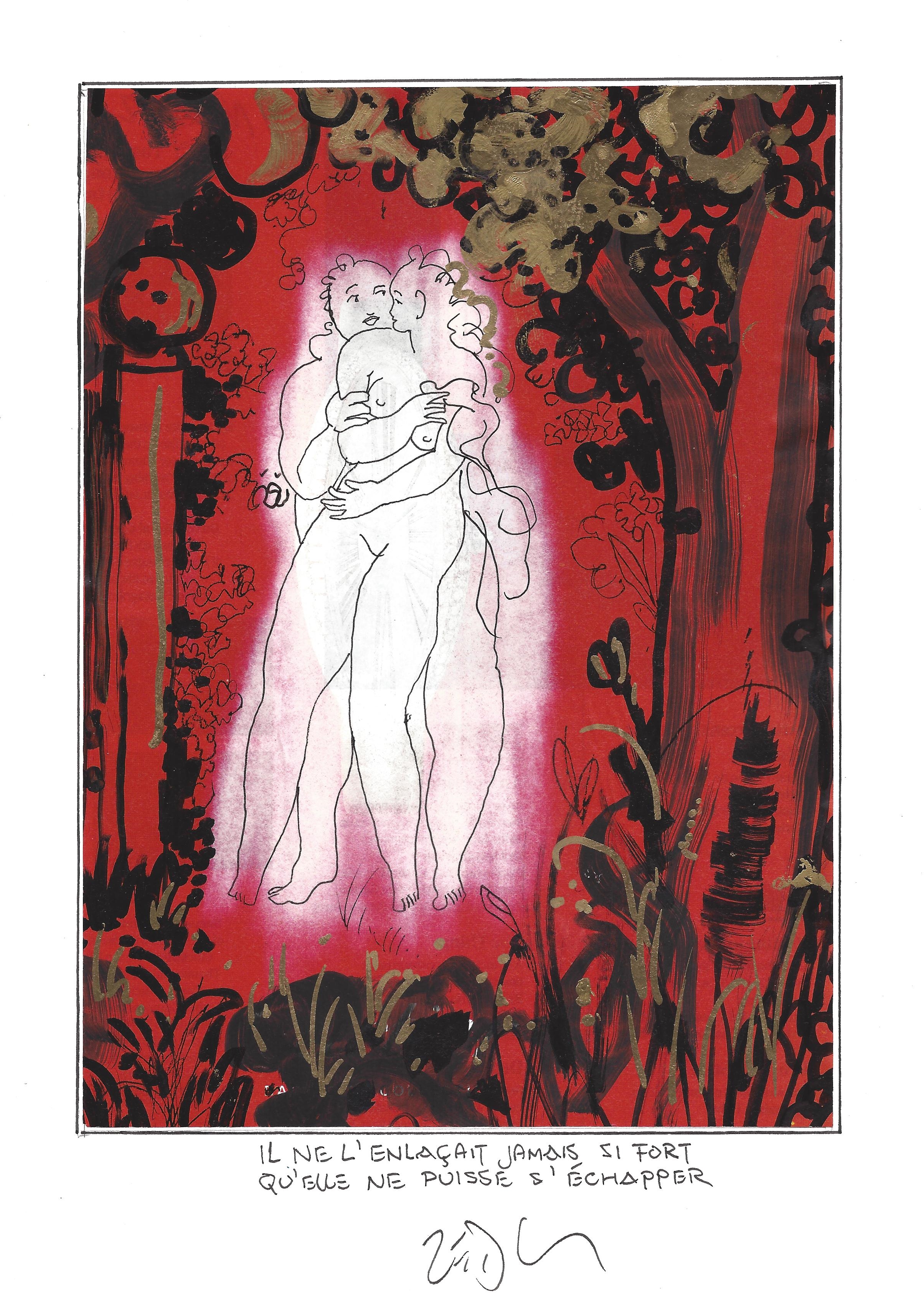 Drawing of the Day – 2379 – Dessin du jour « Never so tight that she couldn’t slip away – Il ne l’enlaçait jamais si fort qu’elle ne puisse s’échapper » Mixed Media on Paper – 8 x 12″ (21 x 30 cm) – Technique mixte sur Papier