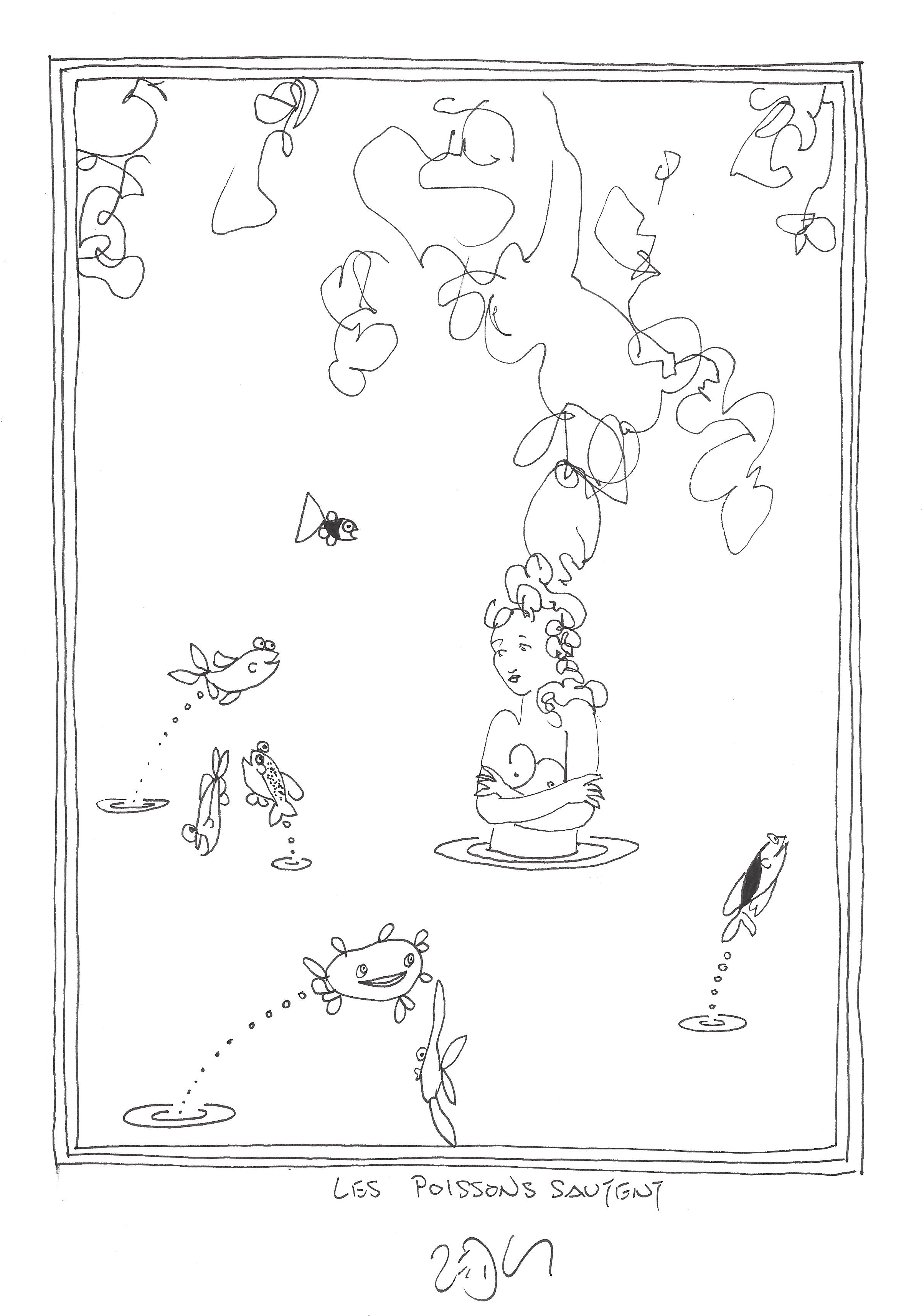 Drawing of the Day – 2382 – Dessin du jour « The fish are jumping – Les poissons sautent » Ink on Paper – 8 x 12″ (21 x 30 cm) – Encre sur Papier