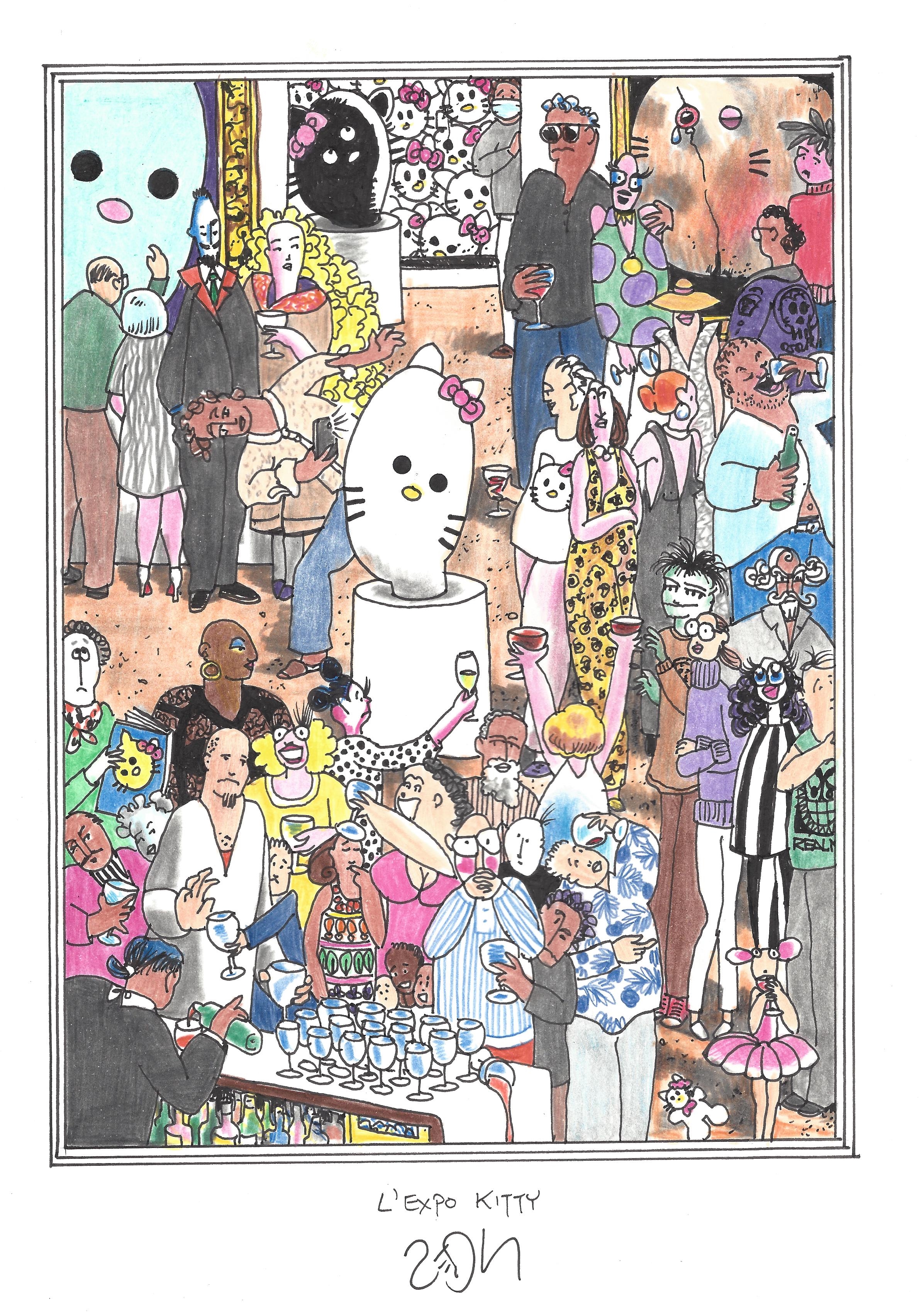 Drawing of the Day – 2402 – Dessin du jour « The Kitty show – L’expo Kitty » Ink & color on Paper – 8 x 12″ (21 x 30 cm) – Encre & couleurs sur Papier
