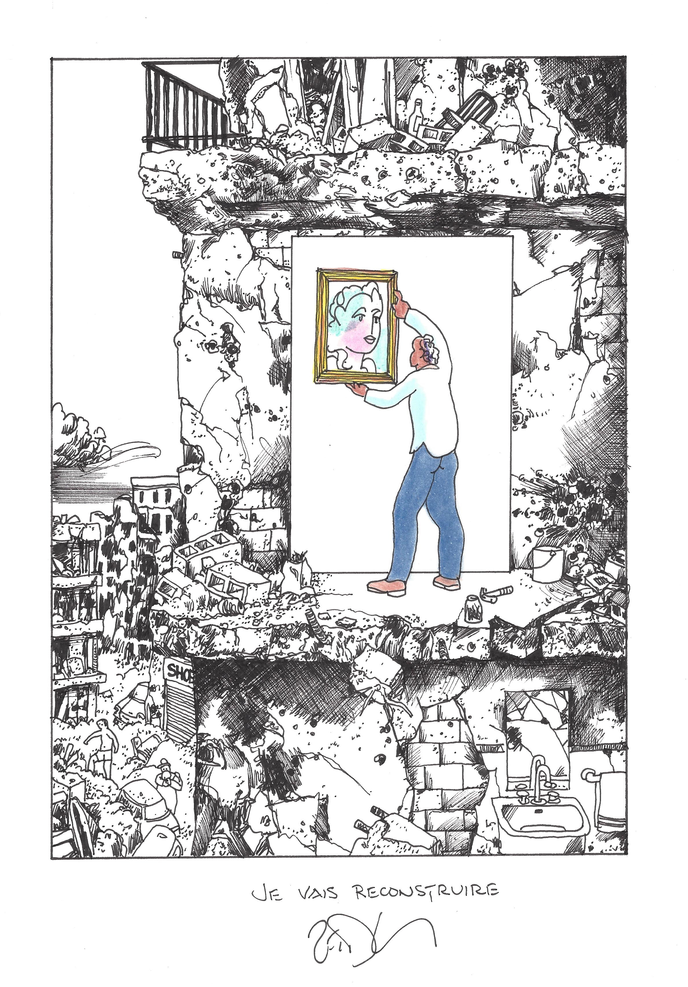 Drawing of the Day – 2409 – Dessin du jour « I will rebuild – Je vais reconstruire » Ink & color on Paper – 8 x 12″ (21 x 30 cm) – Encre & couleurs sur Papier