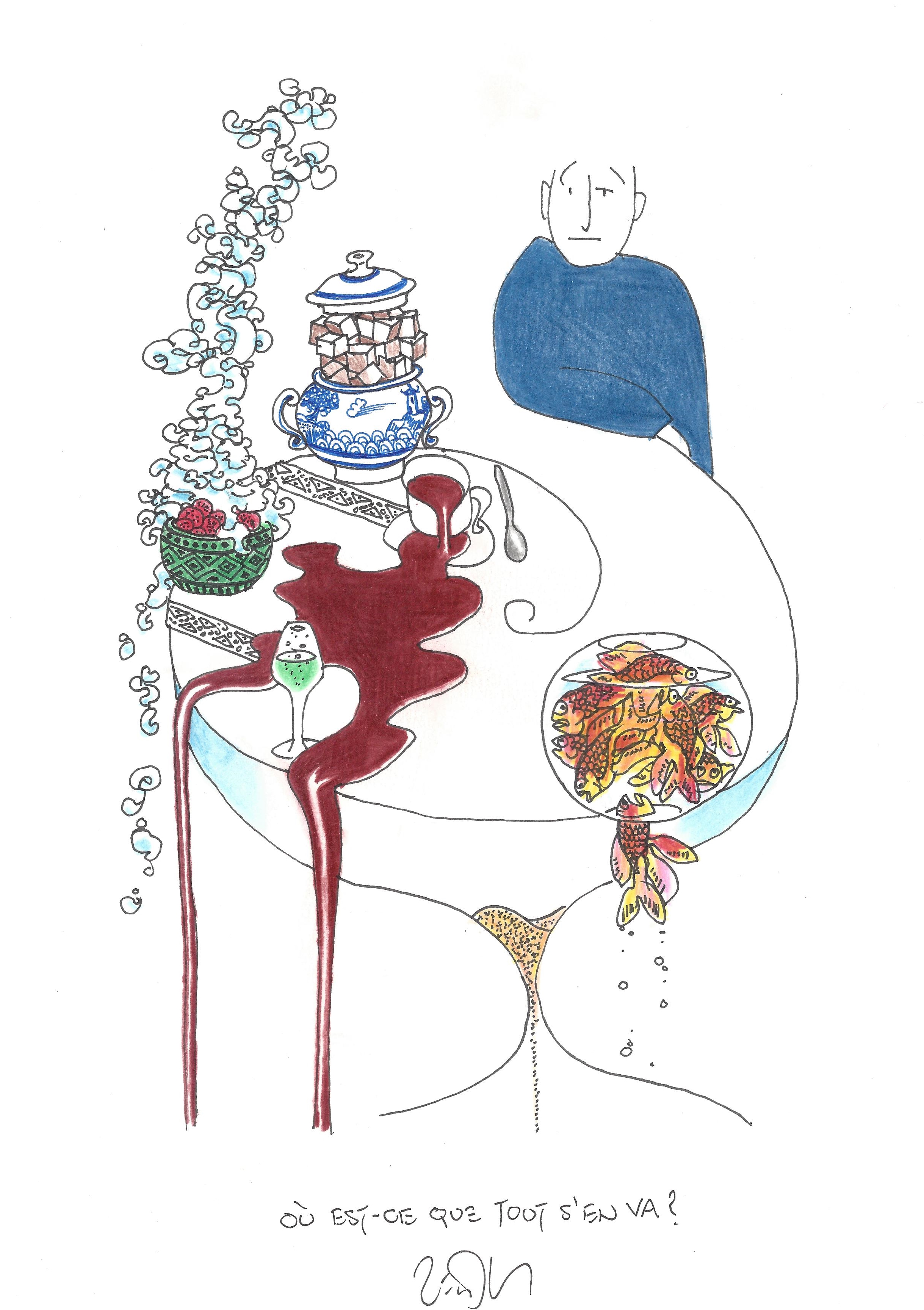 Drawing of the Day – 2891 – Dessin du jour « Where does it all go ? – Où est-ce que tout s’en va ? » Ink & colour on Paper – 8 x 12″ (21 x 30 cm) – Encre & couleurs sur Papier