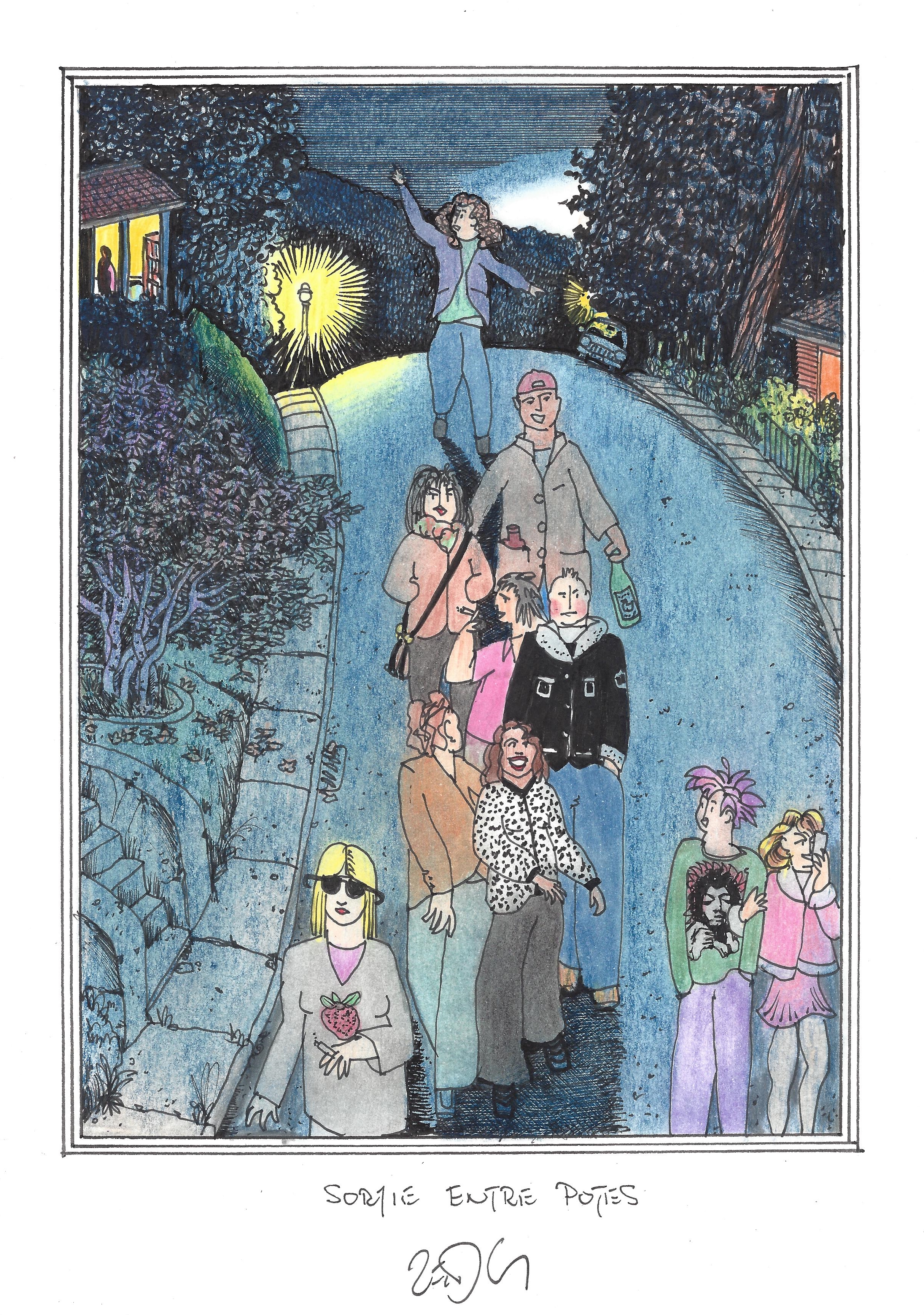 Drawing of the Day – 2902 – Dessin du jour « Out with the gang – Sortie entre potes » Ink & colour on Paper – 8 x 12″ (21 x 30 cm) – Encre & couleurs sur Papier