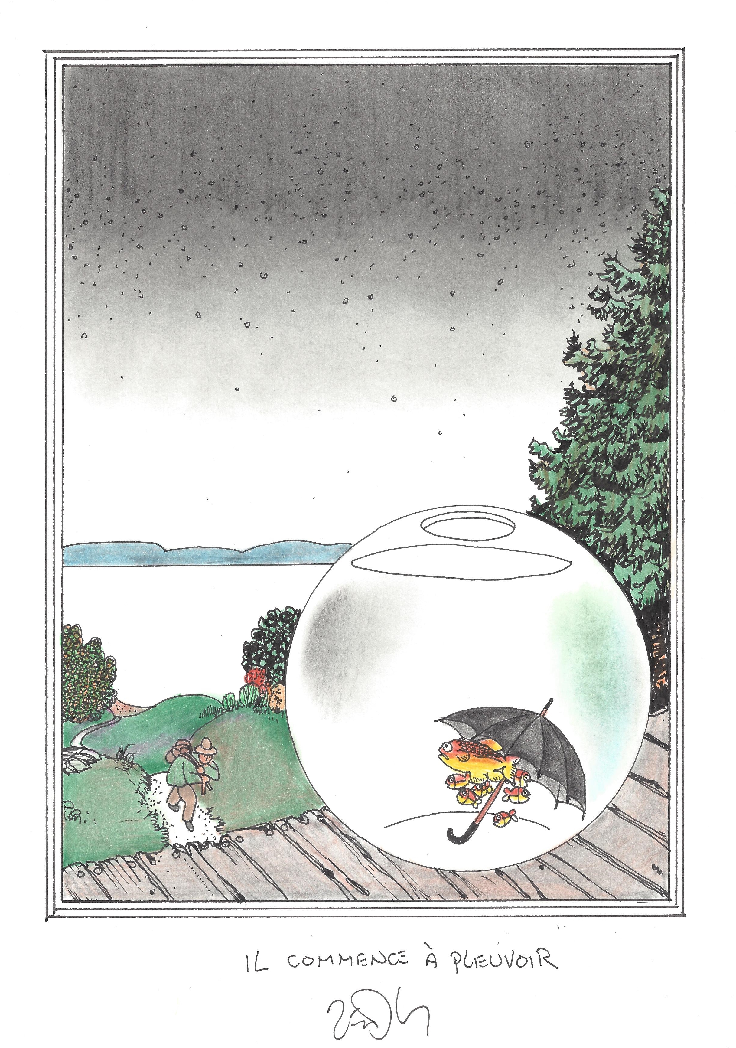 Drawing of the Day – 2917 – Dessin du jour « Starting to rain – Il commence à pleuvoir » Ink & colour on Paper – 8 x 12″ (21 x 30 cm) – Encre & couleurs sur Papier