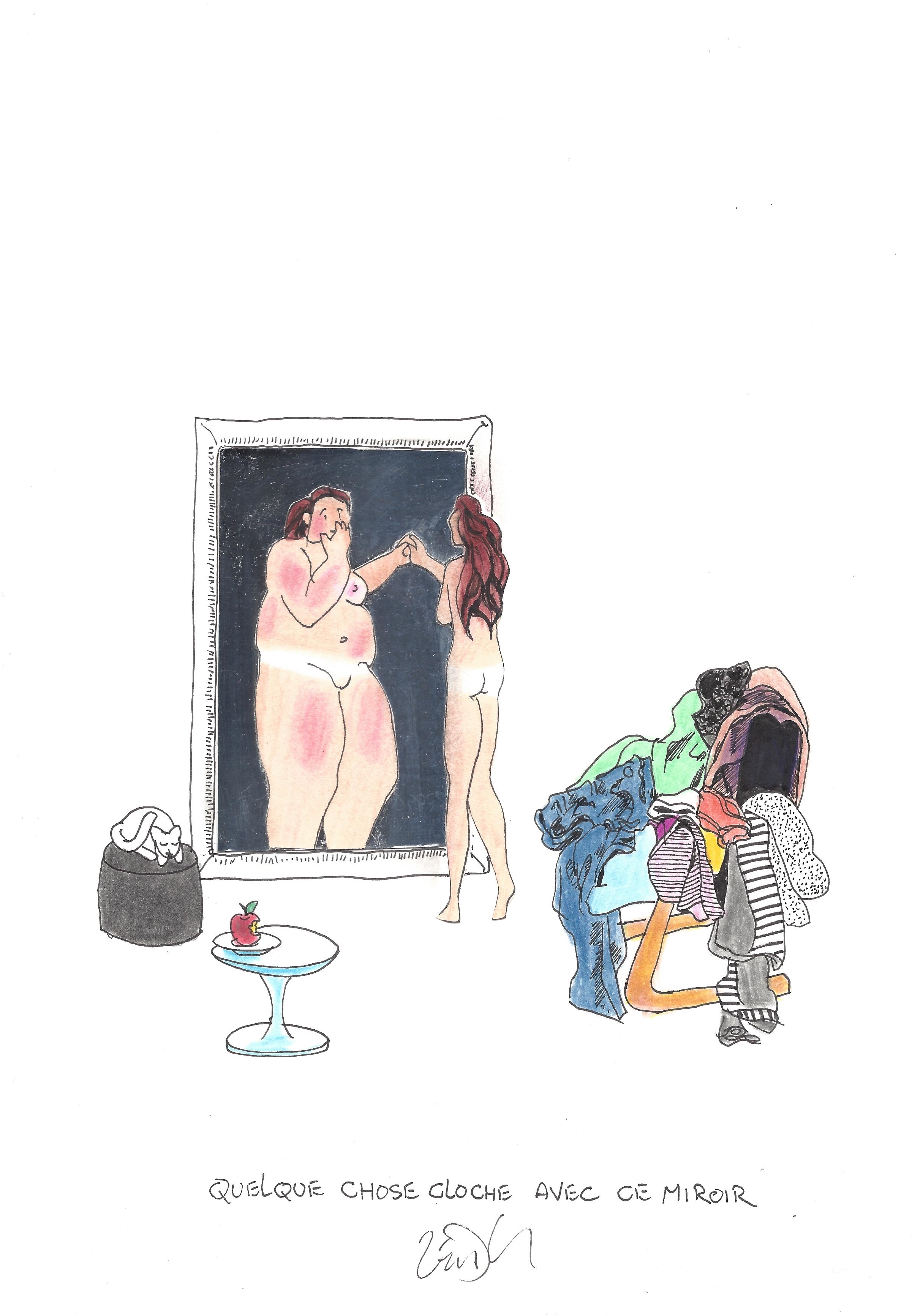 Drawing of the Day – 2928 – Dessin du jour « There’s something wrong with this mirror – Quelque chose cloche avec ce miroir » Mixed Media on Paper – 8 x 12″ (21 x 30 cm) – Technique mixte sur Papier