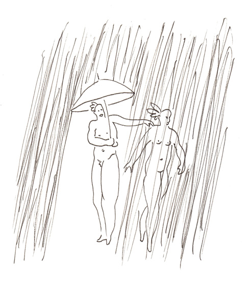 Drawing of the Day – 0058 – Dessin du jour “Out into the rain – Sous la pluie” Ink on Paper 7.5×11″ (18x28cm) Encre sur Papier Drawing of the Day available for CDN $ 99 Dessin du jour disponibles au prix de 99 $ CAD