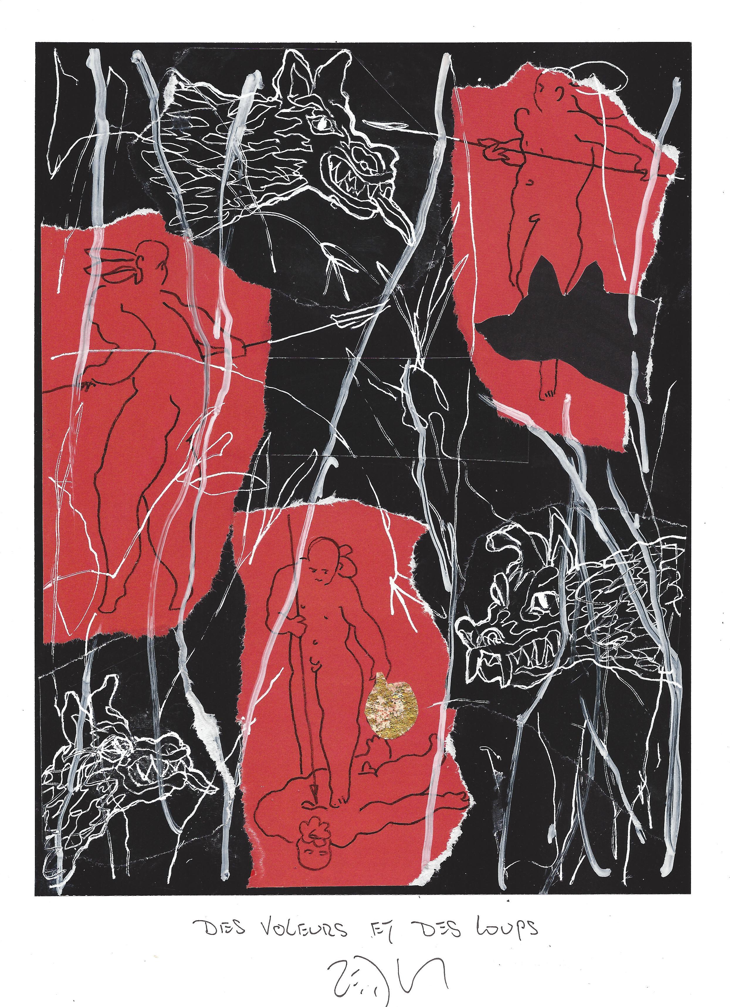 Drawing of the Day – 0847 – Dessin du jour « Thieves and wolves – Des voleurs et des loups » Mixed Media on Paper 8×12″ (21x30cm) Technique mixte sur Papier Drawing of the Day available for CDN$ 150 (125€) Dessin du jour disponible au prix de 125€ (150 $CAD)