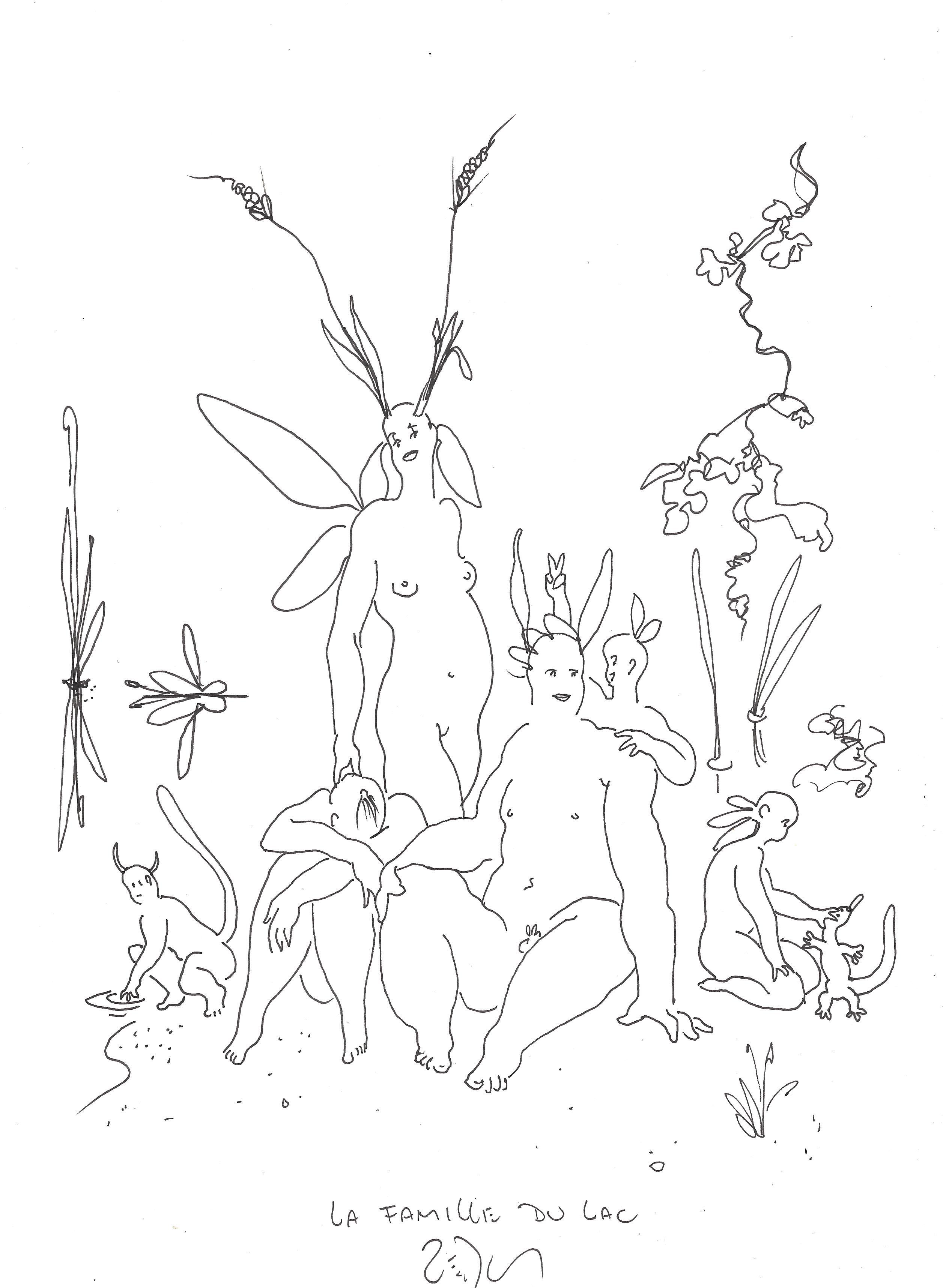 Drawing of the Day – 0858 – Dessin du jour « The family of the lake – La famille du lac » Ink on Paper 8×12″ (21x30cm) Encre sur Papier Drawing of the Day available for CDN$ 150 (125€) Dessin du jour disponible au prix de 125€ (150 $CAD)