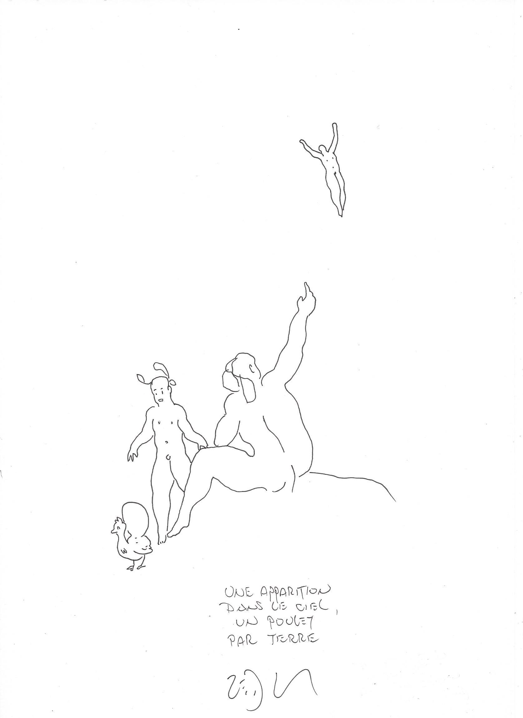 Drawing of the Day – 0888 – Dessin du jour « Apparition in the sky, chicken on the ground – Une apparition dans le ciel, un poulet par terre » Ink on Paper 8×12″ (21x30cm) Encre sur Papier Drawing of the Day available for CDN$ 150 (125€) Dessin du jour disponible au prix de 125€ (150 $CAD)