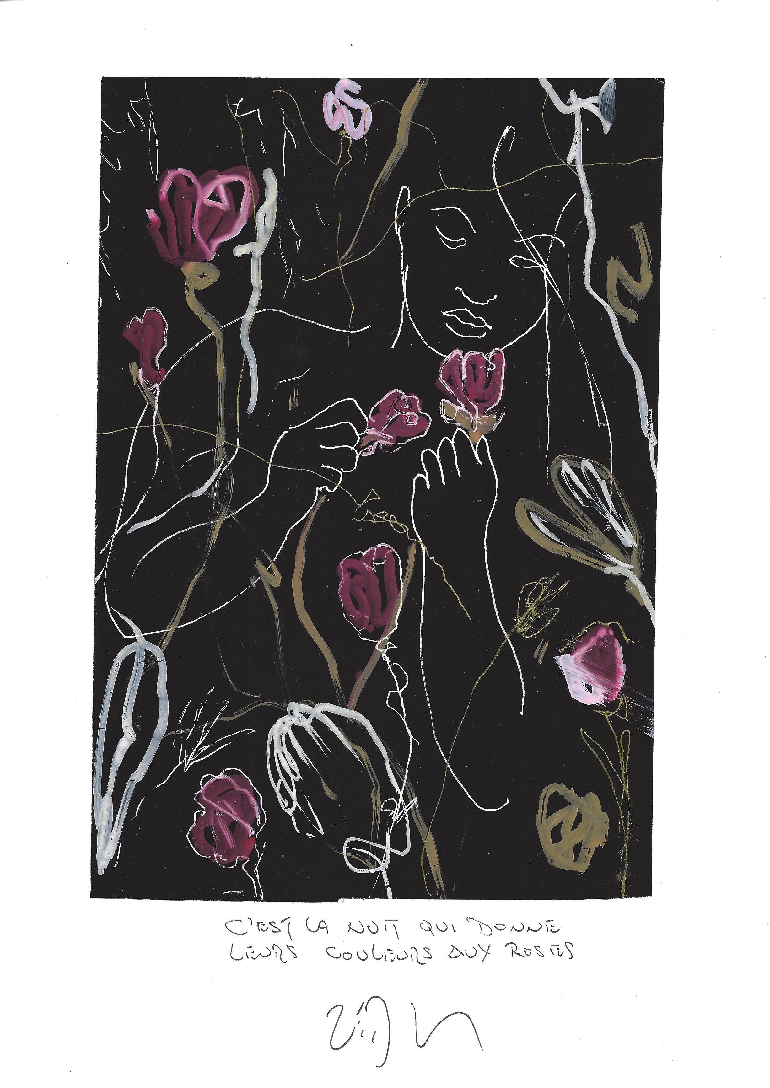 Drawing of the Day – 0906 – Dessin du jour « It is the night that gives roses their color – C’est la nuit qui donne leurs couleurs aux roses » Mixed Media on Paper 8×12″ (21x30cm) Technique mixte sur Papier SOLD