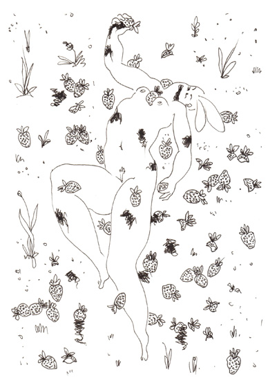 News to me; I didn’t know you can get drunk on strawberries. Thi-hi! But euphoric is a very proper word for the reaction to the taste of the first strawberries of the season (the ones grown out in the fields, not the ones grown in greenhouses). But your lady most certainly looks drunk, with strawberries everywhere. What inspired you to create this drawing, Frank? Smiles