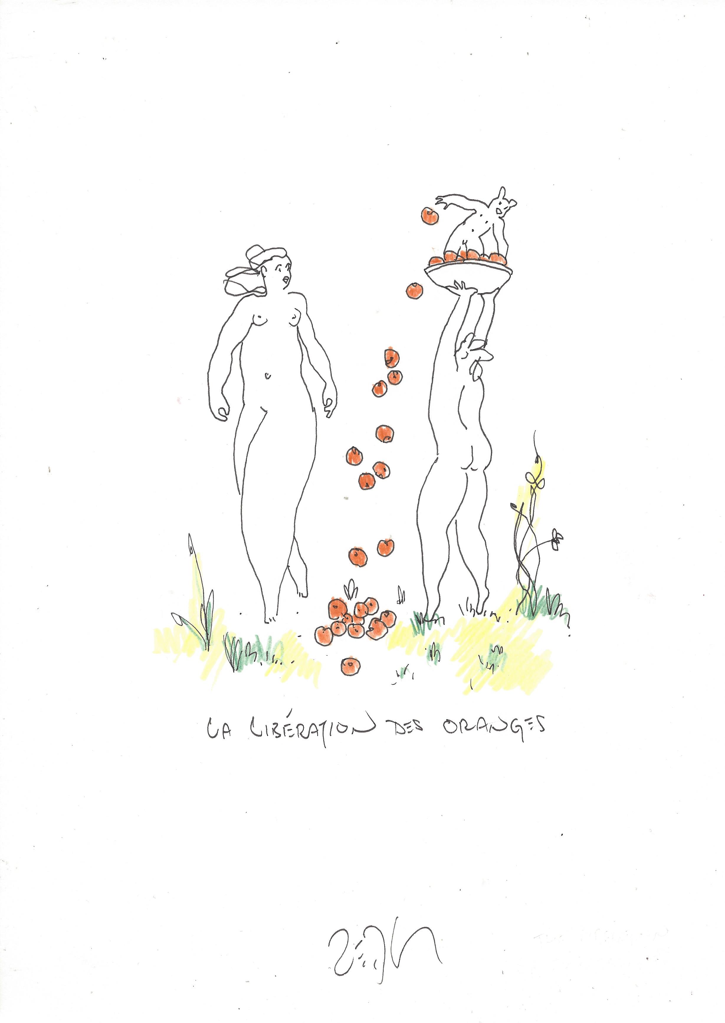 Drawing of the Day – 0974 – Dessin du jour « The liberation of the oranges – La libération des oranges » Ink on Paper 8×12″ (21x30cm) Encre sur Papier Drawing of the Day available for CDN$ 150 (125€) Dessin du jour disponible au prix de 125€ (150 $CAD)